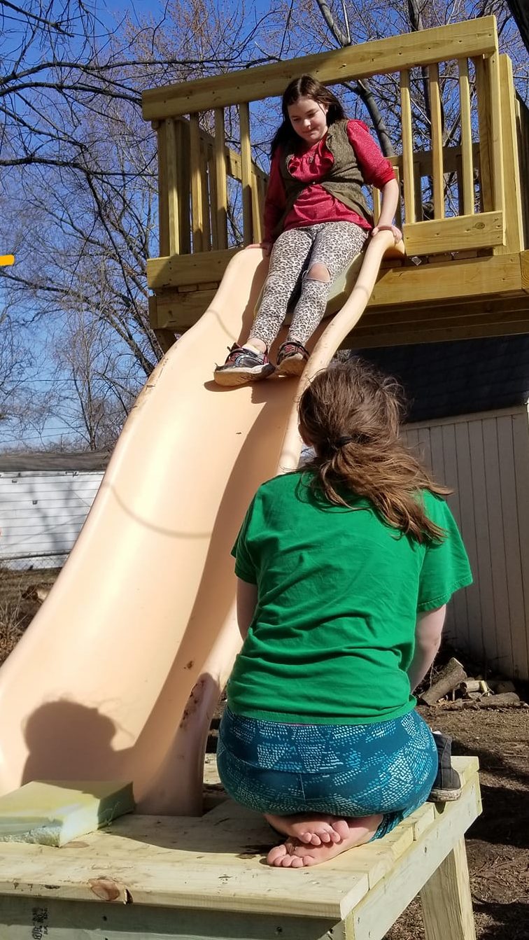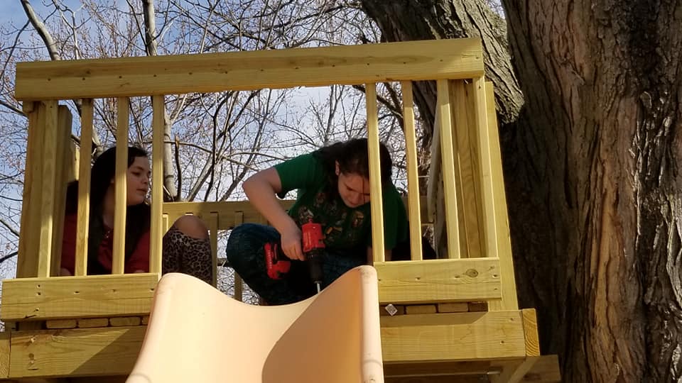 We put the slide up and built a landing for it (also a very sturdy table)! She’s been building “treehouse furniture” and painting with her friends. It’s a great time to have a treehouse.