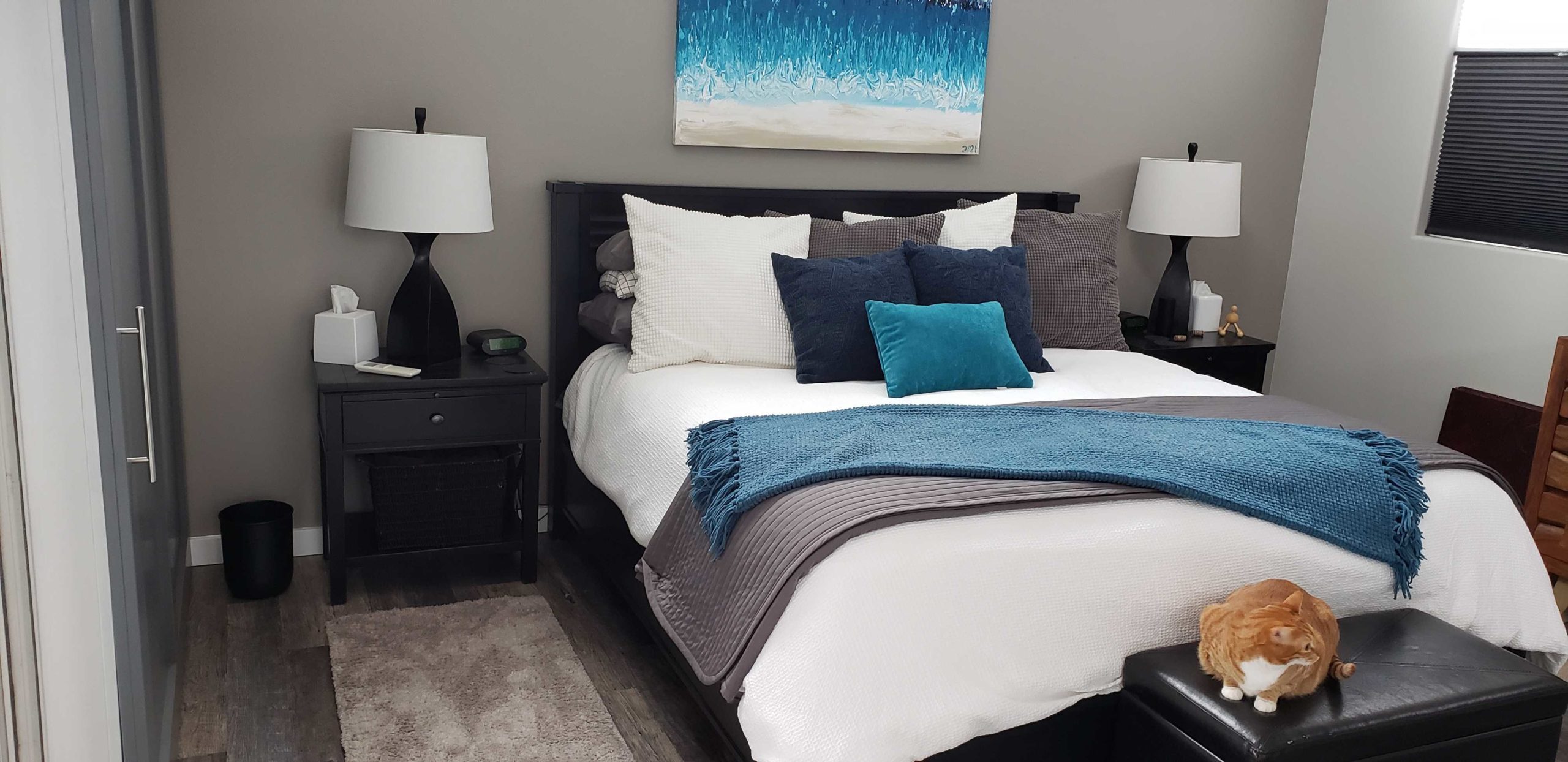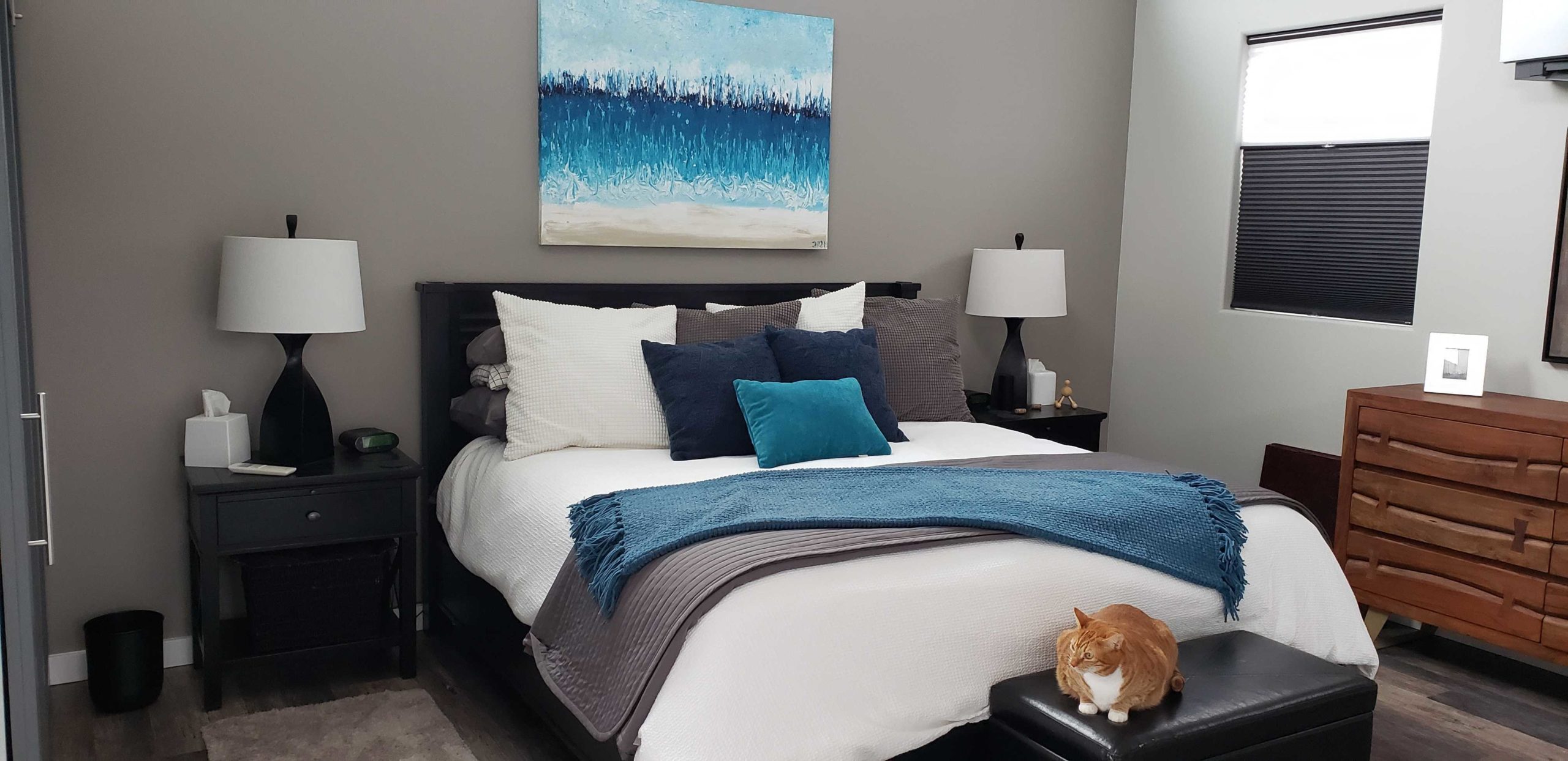As a final touch, I created an abstract painting to go over the bed, using the colors that we already were using for our decor.