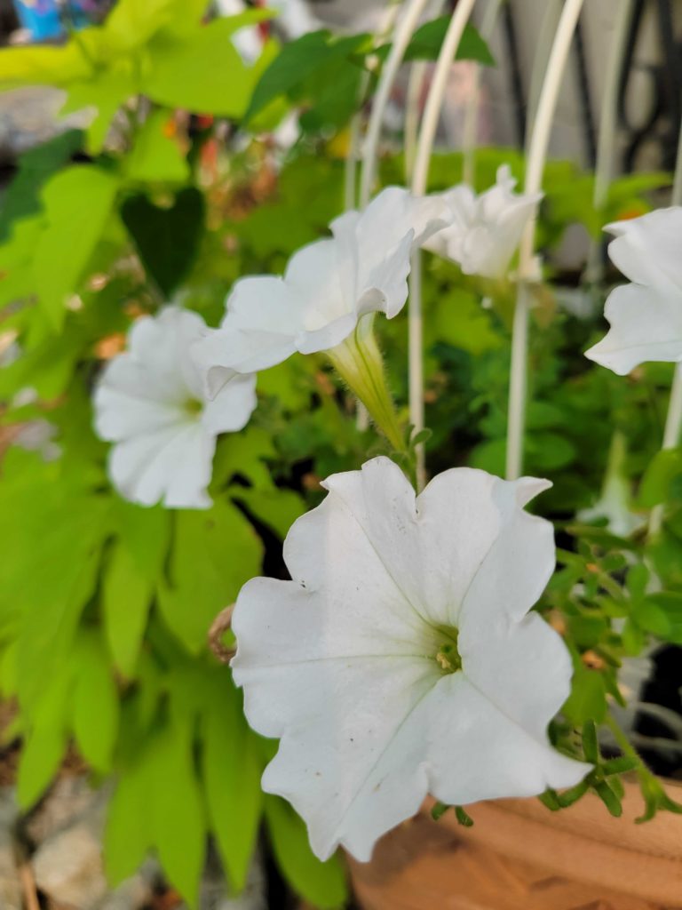 Petunias do well in my back yard and you will see the lime sweet potato vine growing with the white petunia through a bird cage I found in the photo to the left.