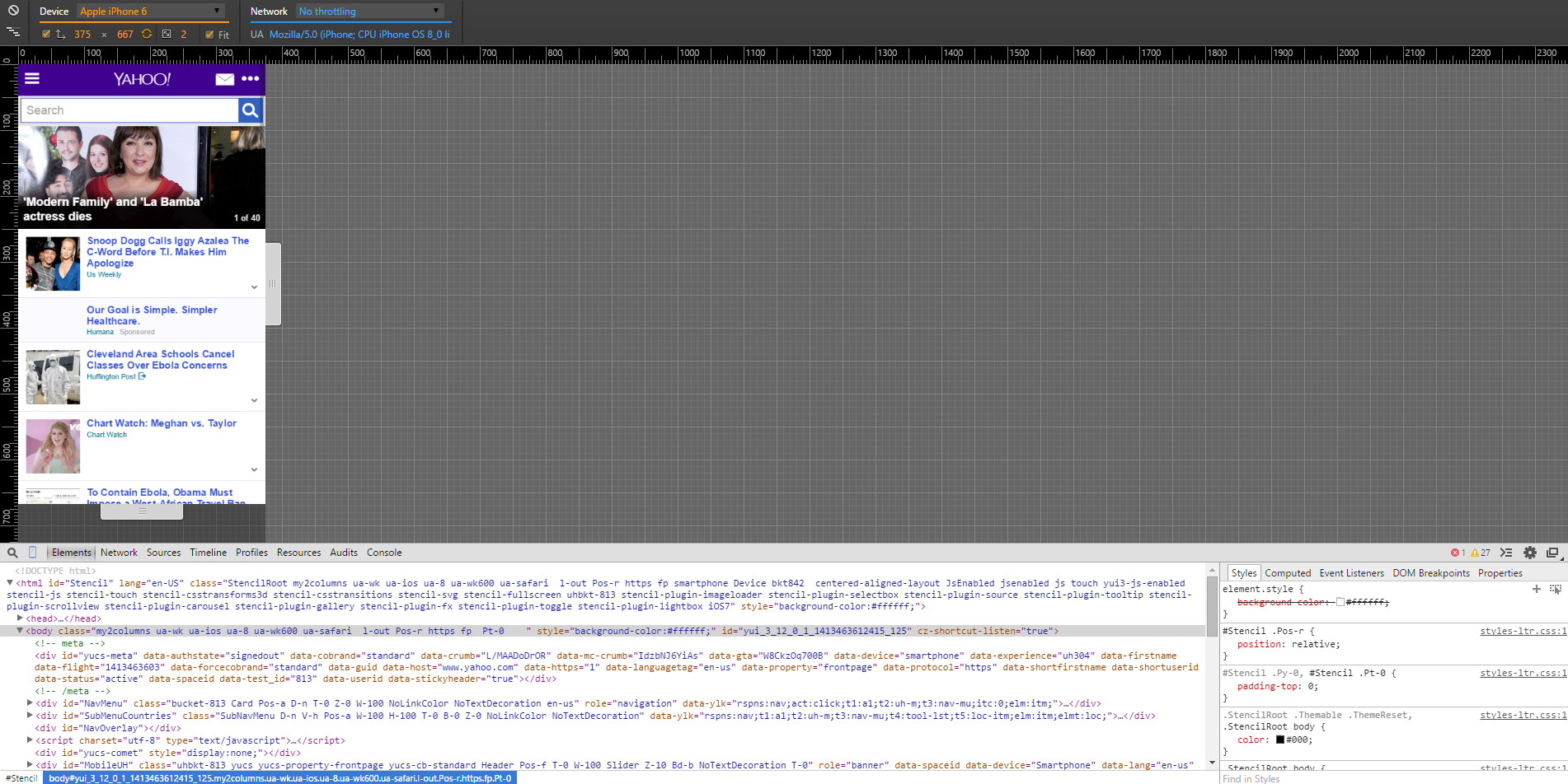 It’s important that we have the ability to test the designs and functions we implement across a wide assortment of devices and we have numerous tools to assist us in this daily task. From desktop widescreens, square monitors (yes, people still use these), handhelds, tablets, and cellphones: we strive to perfect how the site responds in all of these environments. In this image view Yahoo’s website is in full screen on my desktop.