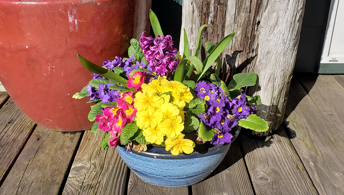 Last year about this time we bought two mixed potted flowers, with primroses around the edges and hyacinths in the middle. I had never owned primroses before, but they were pretty and the hyacinth smelled amazing. Over time, the hyacinth did its thing, blooming, fading, and eventually dying back, to wait the year for its next spring. To my surprise, however, the primroses never stopped blooming all year. They have had constant blooms coming and going and brightening our deck even on the darkest and rainiest days.